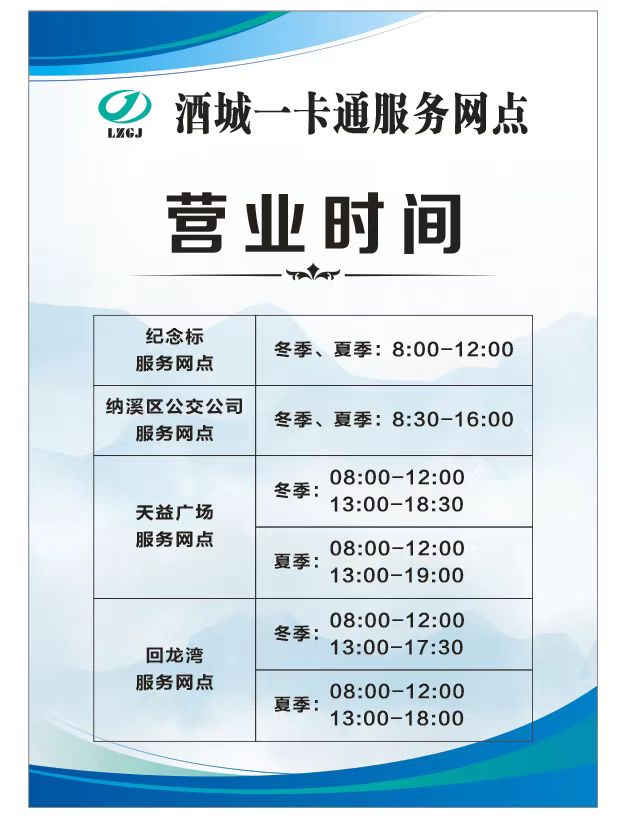 5.年審:本人可在每年任何時(shí)間持身份證或戶口簿到本地任何公交酒城一卡通服務(wù)網(wǎng)點(diǎn)均可年審次年老年卡,逾期未年審的老年卡次年1月1日起不能使用。